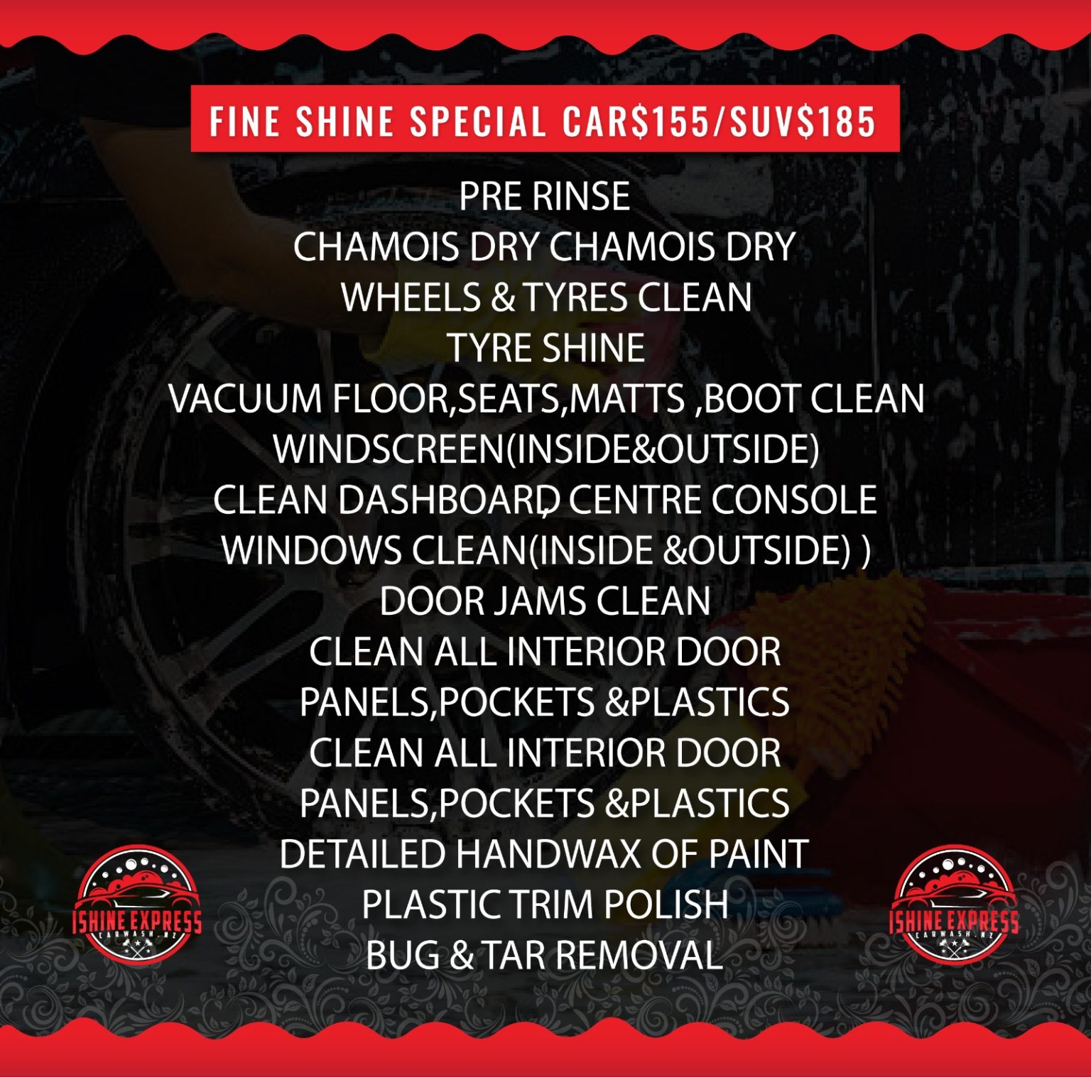 Michael TupouTrustindex verifies that the original source of the review is Google. Have been using ishine for over a year now, keeps my vehicles clean and maintains them well, by far the best 👌 He even details Motorbikes and does a awesome job💯Posted on J ParkTrustindex verifies that the original source of the review is Google. Got seat shampooing service done this morning and I’m so so happy with the service and results. My recently bought car with white fabric seats were extremely dirty till I Shine Express made my seats unrecognisable. Gary even shampooed it twice to get the stains out.Posted on Tony SundersTrustindex verifies that the original source of the review is Google. My car interior was dirty and had a bad smell, so I came here on a friend’s recommendation. The guy was warm and friendly, and the service was excellent. I highly recommend this place—it’s easy to find and very professionalPosted on Jazz ChengTrustindex verifies that the original source of the review is Google. I had this new random nasty spot on the front windscreen. Tried cleaning myself and didn’t work. Found out this place from google. Gary was very polite and professional. He removed it straight away for me. I booked him in for removing other spots that have been there for a long time. He did a great job and the windows look so cleanPosted on Jessica GreethamTrustindex verifies that the original source of the review is Google. Excellent service! Always happy to drop my car off as it comes back as though I bought a brand new car (I have done the express outside wash + vacuum and economy wash + vacuum, depending on state of the car). Great attention to detail and very professional. Highly recommendPosted on Stella WittnerTrustindex verifies that the original source of the review is Google. Very friendly. Even smoke smell could be removed!Posted on Shirley TTrustindex verifies that the original source of the review is Google. Excellent valet and service, thank you!Posted on Arjun NTrustindex verifies that the original source of the review is Google. Got the Fine Shine special. Very happy with the result. Highly recommended for both quality of work and affordability. Will be back!Posted on Rerekauia SavageTrustindex verifies that the original source of the review is Google. Gaurav done a spectacular job. We had a vehicle that was used in a film and sitting for x2 months. It was disgusting, rotten food, food flies, ants and more. He cleaned the entire inside without a problem and still had an awesome attitude when he finished. Well priced too!Posted on Google rating score: 4.8 of 5,